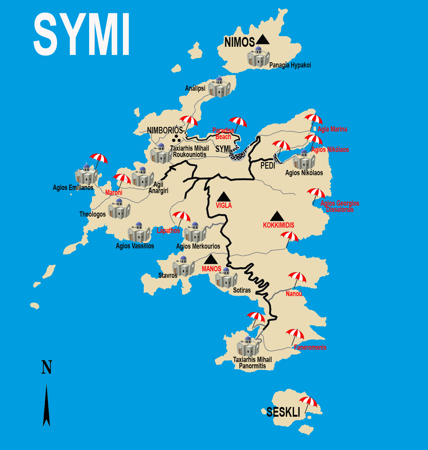 Symi tiene el tamaño adecuado para recorrer a pie su geografía, de altas colinas y paisajes áridos, con muchas bahías ocupadas por playas remotas y solitarias. Además numerosas ermitas adornan el paisaje, sembrado de restos arqueológicos olvidados, a menudo sólo accesibles por sendas que se apartan del camino principal. Dos grandes islotes la rodean, por el norte, Nimos, y por el sur, Seskli-Teftlousa y muchos más, de pequeño tamaño, por su lado occidental.